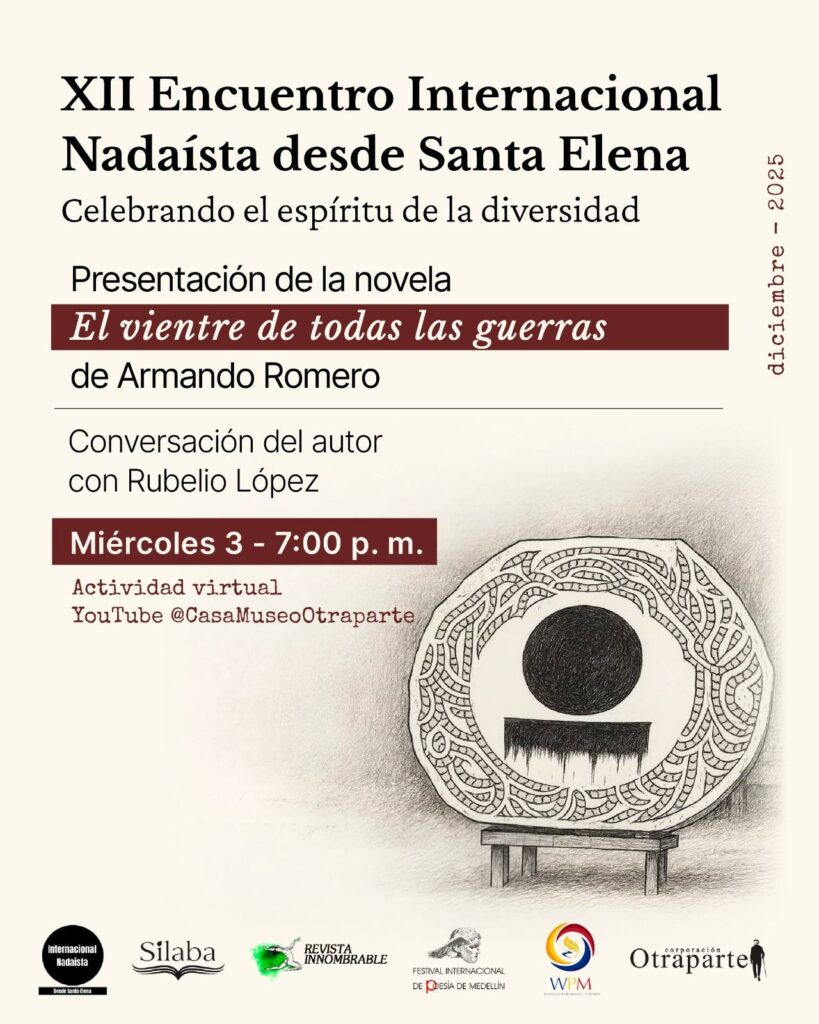 ☆Aliados culturales:Festival Internacional de Poesía de Medellín – WPM ColombiaRevista Innombrable «Colectivo Artístico y Cultural»Sílaba EditoresCasa Museo Otraparte#EncuentroNadaísta#SantaElenaViva#Nadaísmo#ArmandoRomero#ElVientreDeTodasLasGuerras#SílabaEditores#PoesíaViva#Contracultura#LiteraturaColombiana#PensamientoCrítico#DiversidadCultural#TerritorioPoéticoPresidencia de la República de ColombiaMinisterio de las Culturas, las Artes y el PatrimonioRTVC NoticiasRTVC Sistema de Medios PúblicosConsejo Distrital de Cultura Medellín
